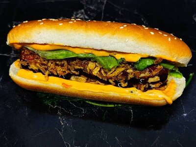 Сосиска андреевская куриная, соусы фирменные, свежий салат из пекинской капусты, лук, корейская морковь, огурцы по сезону, свежие помидоры